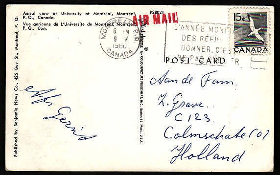 #9945 - 15c Gannet on postcard airmail to Holland - Montreal , PQ - 9 V 1960 - 15c franking pays the 15c airmail rate to Holland