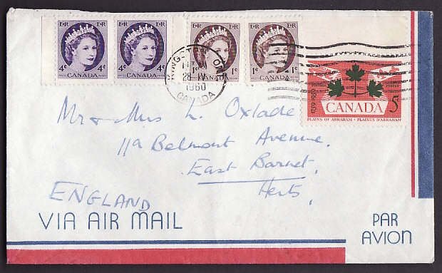 #9949 - 1c(2)+4c(2) Wildings+5c Plains of Abraham airmail to England - Frontenac County - Kingston , Ont - 28 IV 1960 -15c franking pays the 15c airmail rate to England