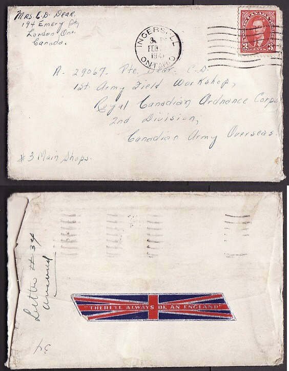 #9967 - 3c KGVI mufti , addressed to "1st Army Field Workshop , Royal Canadian Ordinance Corps , 2nd Division , Canadian Army Overseas" - Oxford County - Ingersoll , Ont - Feb 2? 1941 - patriotic England flag seal on back "There'll Always Be An England" -