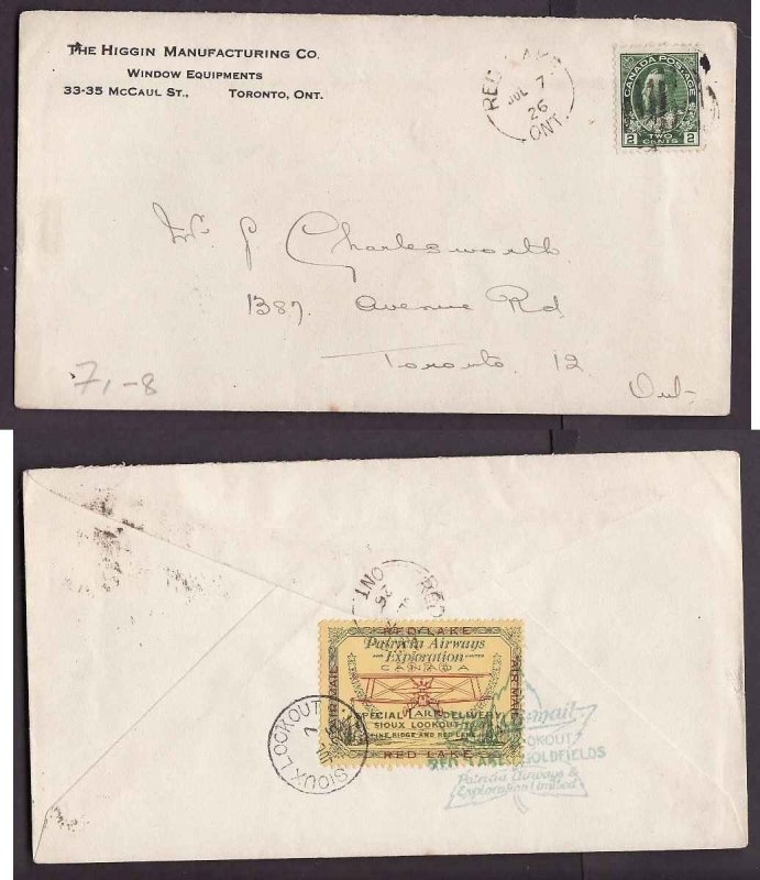CL13- #14066-2c Admiral-Patricia Airways Exploration [commercial cover] Jul 7 1926 first flight Red Lake to Sioux Lookout [AAM# CL13-2602a] - B/S Sioux Lookout - Jul 7 1926 - Green Leaf cachet was applied to those covers mailed originally from Toronto - insurance reflects cost of tracking-