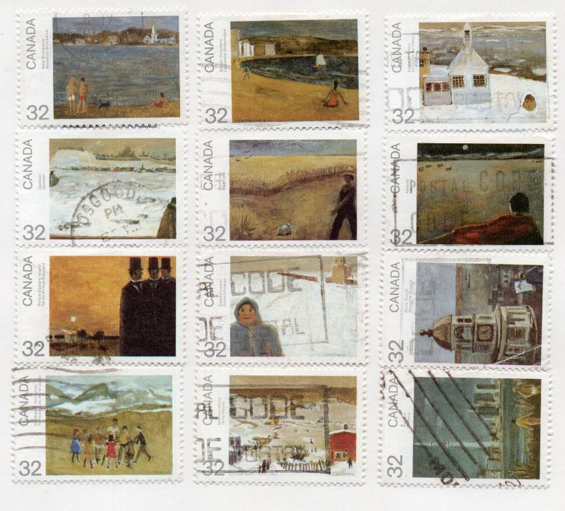 Canada Scott & Unitrade Catalogue number 1016-1027 1984 Canada Day Lemieux Paintings stamp set .Used, fine to very fine .Member Canadian Stamp Dealers AssociationCanadian Customers - No added GST/HST .US customers - There is no tariff on postage stamps that I send to you.