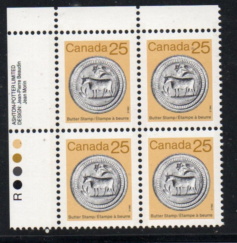 Canada   Scott & Unitrade  Catalogue number 1080 1987 25 c Butter Stamp stamp Inscription Block of 4 Upper Left, Ashton-Potter Ltd .Mint, fine to very fine, original gum never hinged .Member Canadian Stamp Dealers AssociationCanadian Customers - No added GST/HST .US customers - There is no tariff on postage stamps that I send to you.