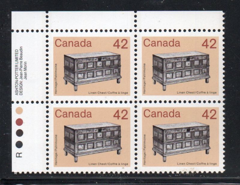Canada   Scott & Unitrade  Catalogue number 1081 1987 42 c Linen Chest stamp Inscription Block of 4 Upper Left, Ashton-Potter Ltd .Mint, fine to very fine, original gum never hinged .Member Canadian Stamp Dealers AssociationCanadian Customers - No added GST/HST .US customers - There is no tariff on postage stamps that I send to you.