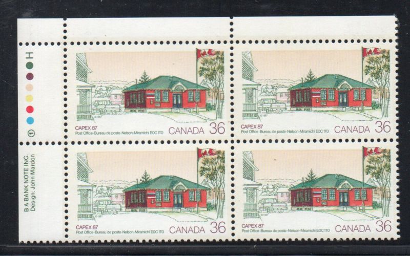 Canada Scott & Unitrade Catalogue number 1123 1987 36 cent Nelson- Miramichi Post Office stamp Inscription Block of 4 Upper Left, B A Bank Note Inc. .