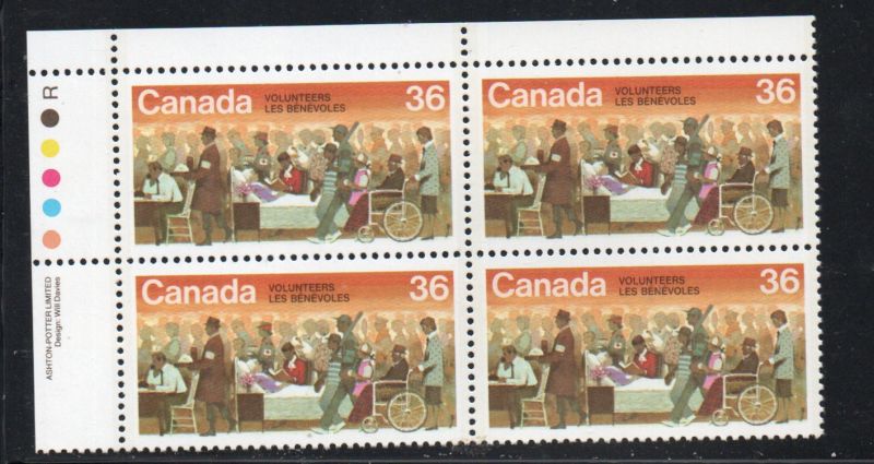 Canada   Scott & Unitrade  Catalogue number 1132  1987 36 cent Volunteers Week stamp Inscription Block of 4 Upper Left, Canadian Bank Note .Mint, fine to very fine, original gum never hinged .Member Canadian Stamp Dealers AssociationCanadian Customers - No added GST/HST .US customers - There is no tariff on postage stamps that I send to you.