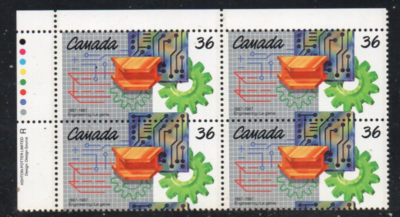 Canada   Scott & Unitrade  Catalogue number 1134  1987 36 cent Engineering Institute Centenary stamp Inscription Block of 4 Upper Left, Aston-Potter Limited .Mint, fine to very fine, original gum never hinged .Member Canadian Stamp Dealers AssociationCanadian Customers - No added GST/HST .US customers - There is no tariff on postage stamps that I send to you.