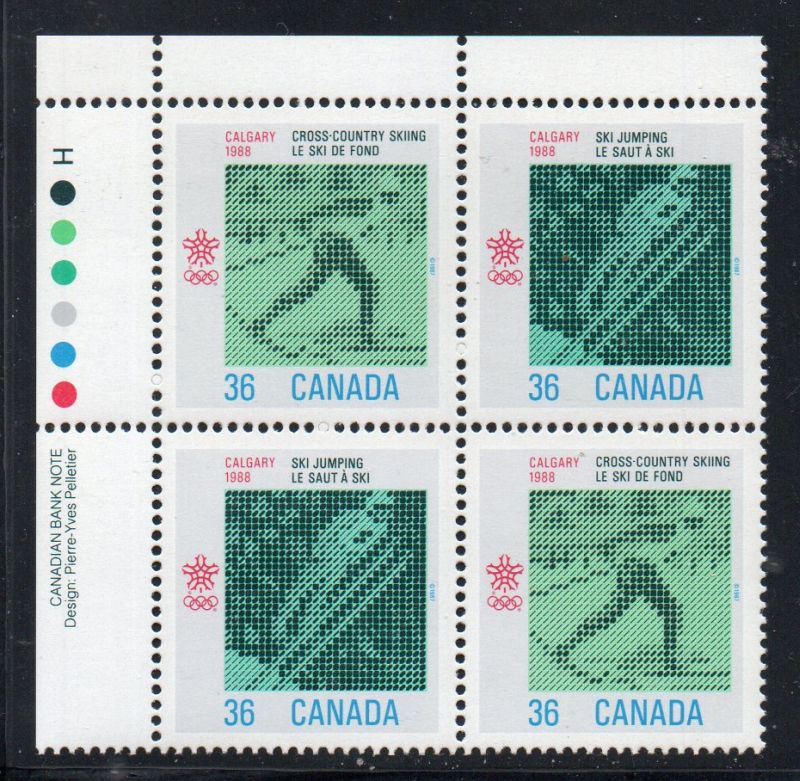Canada Scott Catalogue number 1152-1153 1987 37 cent Calgary Winter Olympics  Upper Left Inscription  Block of 4, B.A. Canadian Bank Note .Mint, fine to very fine original gum never hinged .Canadian Customers - no added GST/HSTUS customers - No tariffs on stamps sent by meMember Canadian Stamp Dealers Association