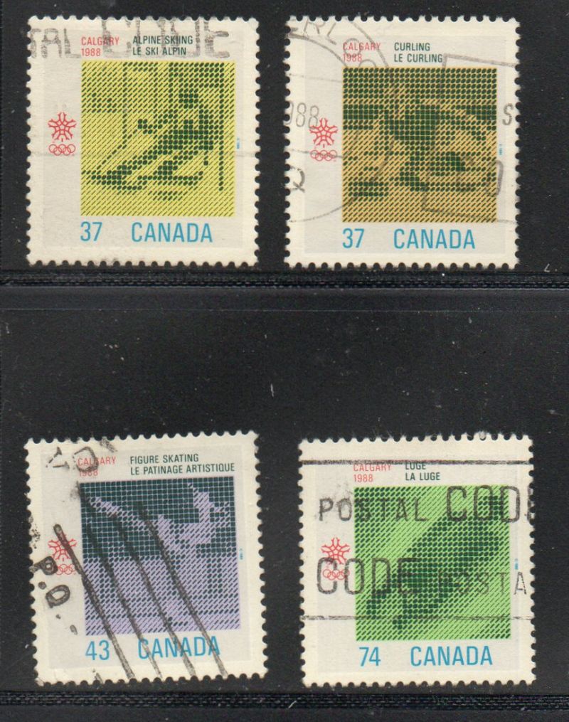 Canada Scott & Unitrade Catalogue number 1195-1198 1988 Calgary Winter Olympics stamp set .Used, fine to very fine .Canadian Customers - no added GST/HSTUS customers - No tariffs on stamps sent by meMember Canadian Stamp Dealers Association