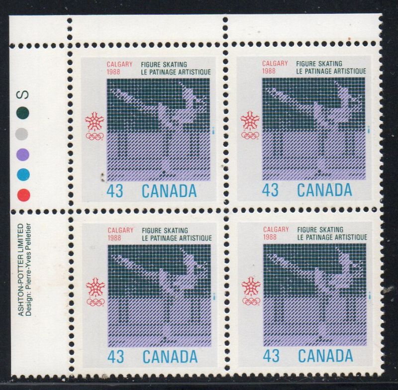 Canada Scott Catalogue number 1197 1988 43 cent 75th Calgary Winter Olympics  Upper Left Inscription  Block of 4, Ashton-Potter LimitedMint, fine to very fine original gum never hinged .Canadian Customers - no added GST/HSTUS customers - No tariffs on stamps sent by meMember Canadian Stamp Dealers Association
