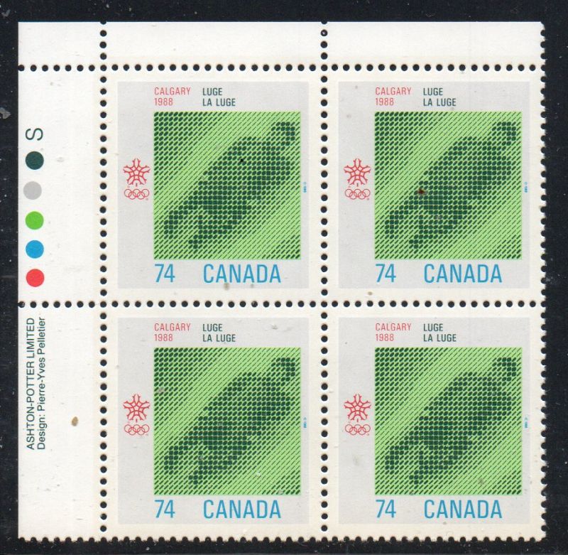 Canada Scott Catalogue number 1198 1988 74 cent 75th Calgary Winter Olympics Upper Left Inscription Block of 4, Ashton-Potter Limited