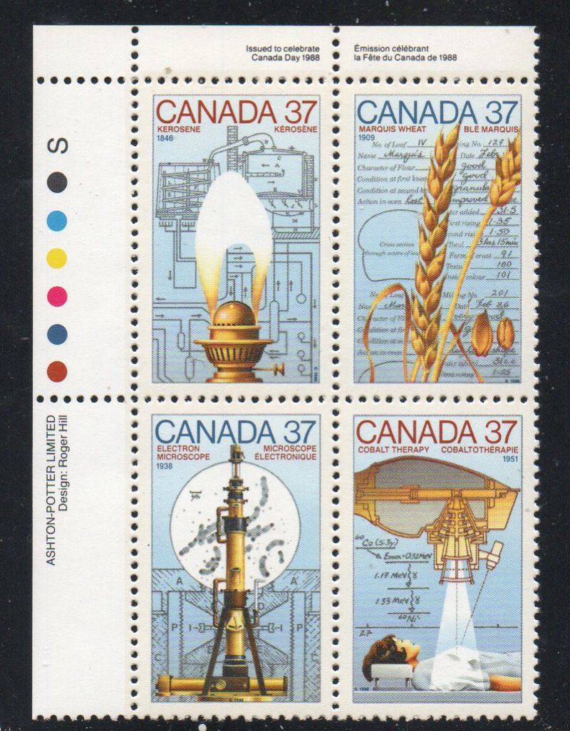 Canada Scott Catalogue number 1206-1208 1988 37 cent  Science & Technology Upper Left Inscription  Block of 4, Ashton-Potter Limited .Mint, fine to very fine original gum never hinged .Canadian Customers - no added GST/HSTUS customers - No tariffs on stamps sent by meMember Canadian Stamp Dealers Association