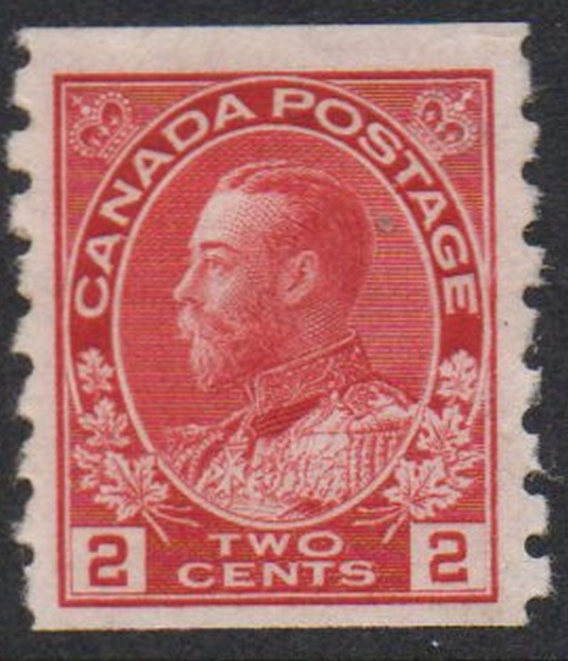 Canada Scott & Unitrade Catalogue number 127 1912 2 cent carmine George V Admiral issue coil stamp  perforated 8 vertical.Mint, fine, original gum hinged .Member Canadian Stamp Dealers Association .Canadian Customers - I pay the GST/HST on your purchases from me .25-8-82.jpg
