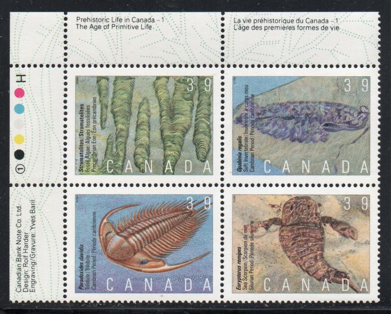 Canada Scott Catalogue number 1279-1282 1990 39 cent Prehistoric Life Upper Left Inscription Block of 4, Canadian Bank Note Co Ltd.