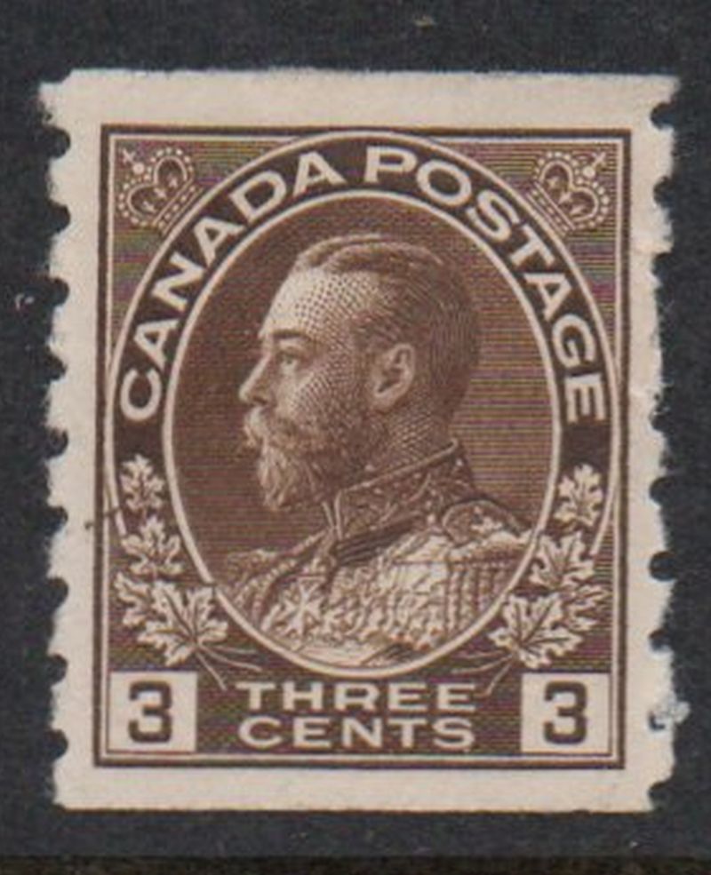 Canada Scott & Unitrade Catalogue number 129 1918 3 cent brown George V Admiral issue coil stamp  perforated 8 vertical.Mint, fine, original gum hinged .Member Canadian Stamp Dealers Association .Canadian Customers - I pay the GST/HST on your purchases from me .25-8-84.jpg