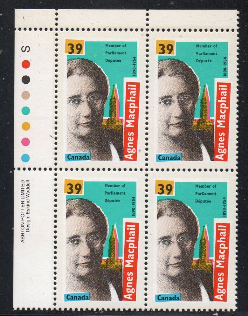 Canada Scott Catalogue number 1293 1990 39 cent Agnes Macphail Upper Left Inscription Block of 4, Ashton-Potter Limited.