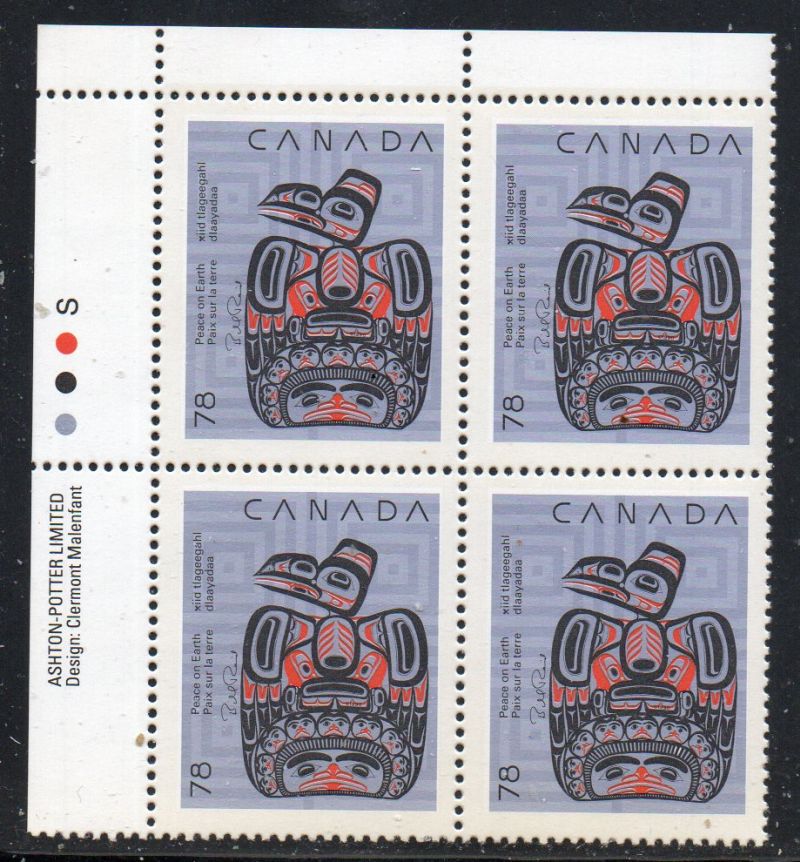 Canada Scott Catalogue number 1296 1990 78 cent Christmas Upper Left Inscription  Block of 4, Ashton-Potter LimitedMint, fine to very fine original gum never hinged .Canadian Customers - no added GST/HSTUS customers - No tariffs on stamps sent by meMember Canadian Stamp Dealers Association
