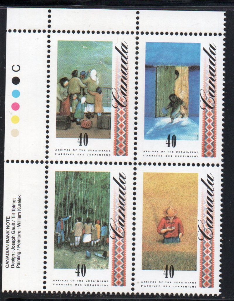 Canada Scott Catalogue number 1326-1329 1991 40 cent Arrival of Ukrainians  Upper Left Inscription  Block of 4, Canadian Bank NoteMint, fine to very fine original gum never hinged .Canadian Customers - no added GST/HSTUS customers - No tariffs on stamps sent by meMember Canadian Stamp Dealers Association