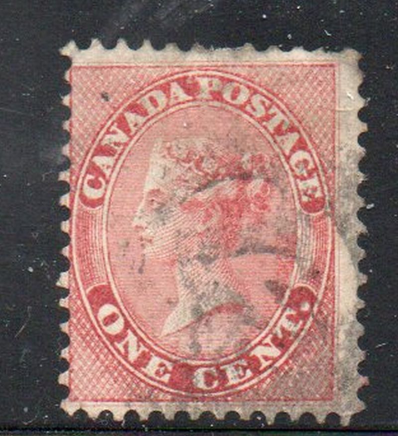 Canada Scott & Unitrade Catalogue number 14 1859 1 cent rose Victoria stamp .Used, very good .Canadian Customers - No added GST/HST .US customers - There is no tariff on postage stamps that I send to you.26-1-26.jpg