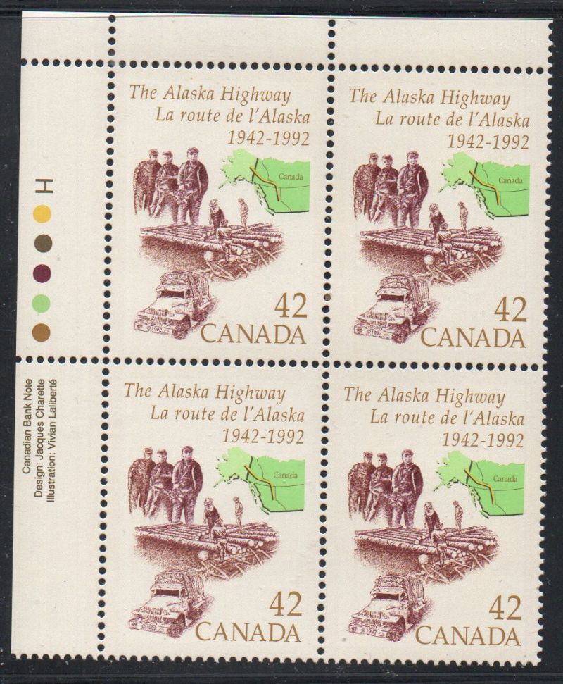 Canada Scott Catalogue number 1413 1992 42 cent Alaska Highway Upper Left Inscription Block of 4, Canadian Bank Note