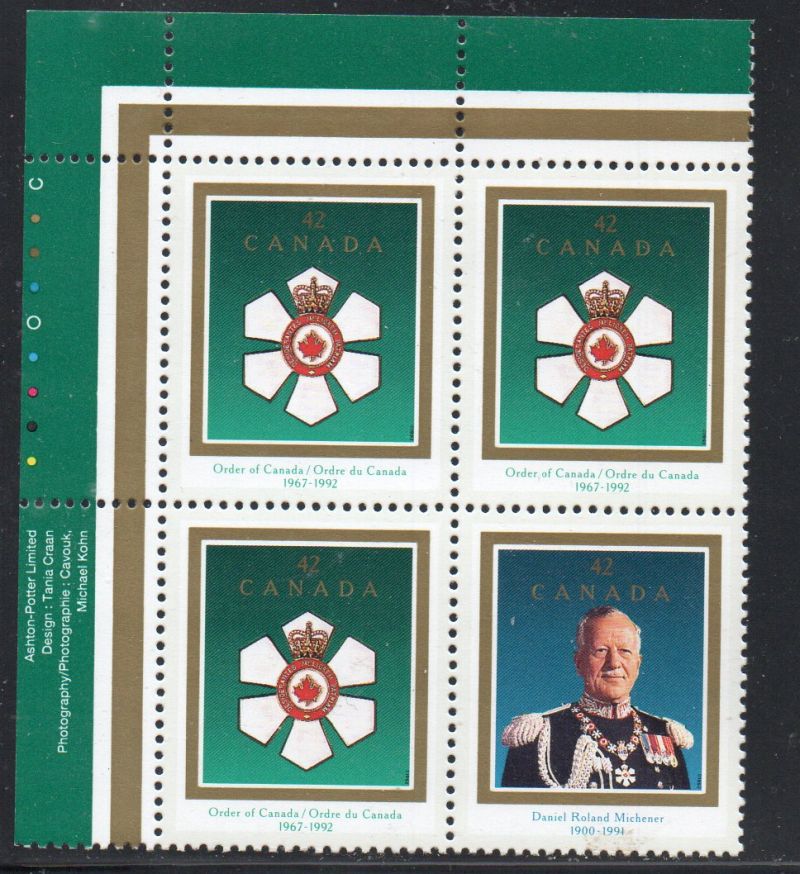 Canada Scott Catalogue number 1442a 1992 42c Order of Canada, Roland Michener, Upper Left Inscription Block of 4,Ashton-Potter Ltd