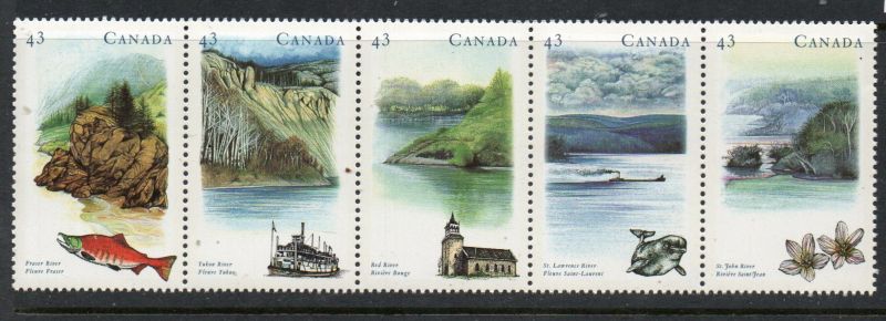 Canada Scott & Unitrade Catalogue number 1489a 1993 Canadian Rivers stamp strip of 5.Mint, fine to very fine, original gum never hinged .Member Canadian Stamp Dealers Association .Canadian Customers - No added GST/HST on your purchases from me .