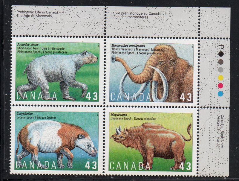 Canada Scott Catalogue number 1532a 1994 43 cent Prehistoric Animals Upper Right Inscription Block of 4,Canadian Bank Note
