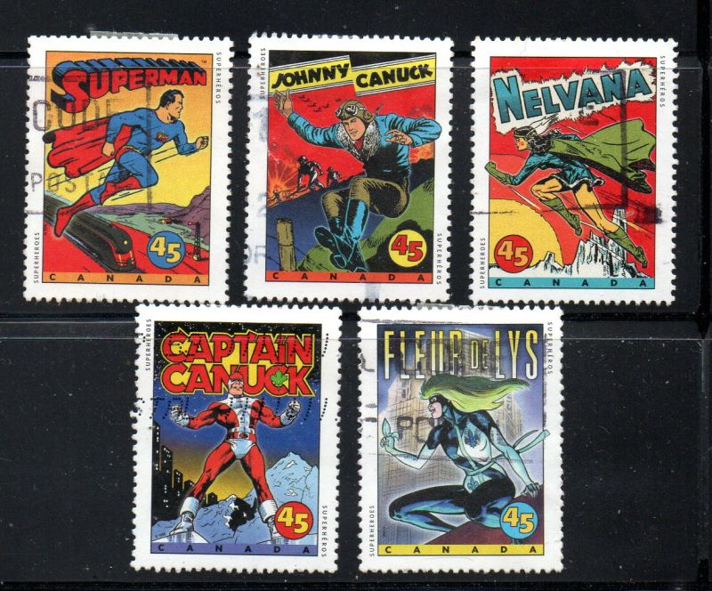 Canada Scott & Unitrade number 1579-1583 1995 Comic Book Superheroes stamp set .Used, fine to very fine .Member Canadian Stamp Dealers Association .Canadian Customers - I pay the GST/HST on your purchases from me .