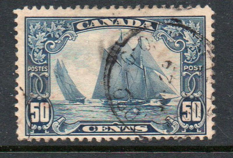 Canada Scott & Unitrade Catalogue number 158 1929 50 cent blue Schooner "Bluenose" stamp .Used, just fine.Canadian Customers - no added GST/HSTUS customers - No tariffs on stamps sent by meMember Canadian Stamp Dealers Association26-2-44.jpg