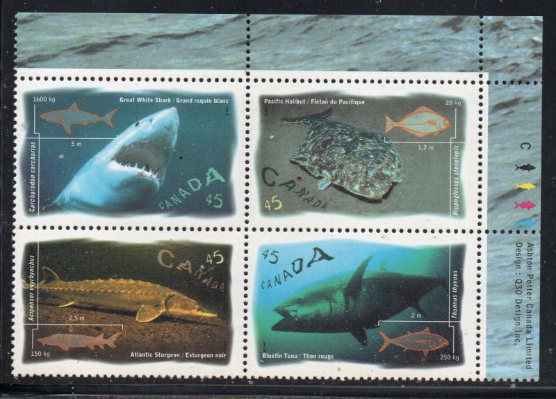 Canada Scott Catalogue number 1644a 1997 45 cent Ocean Fish Upper Right  Inscription  Block of 4, Ashton-Potter Canada Limited .Mint, fine to very fine original gum never hinged .Canadian Customers - no added GST/HSTUS customers - No tariffs on stamps sent by meMember Canadian Stamp Dealers Association