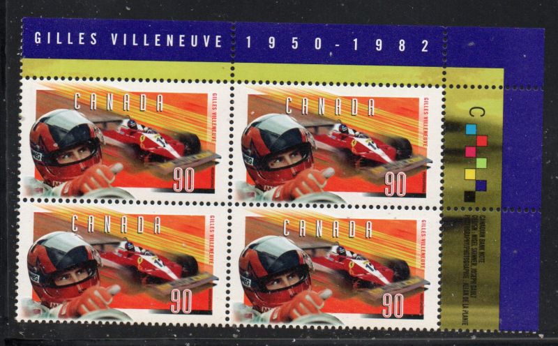 Canada Scott Catalogue number 1648 1997 90 cent Gilles Villeneuve, Racing Car Driver, Upper Right Inscription Block of 4, Canadian Bank Note Limited