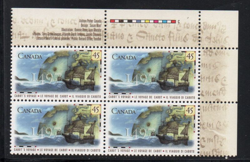 Canada Scott Catalogue number 1649 1997 45 cent John Cabot Upper Right Inscription Block of 4, Ashton-Potter Canada