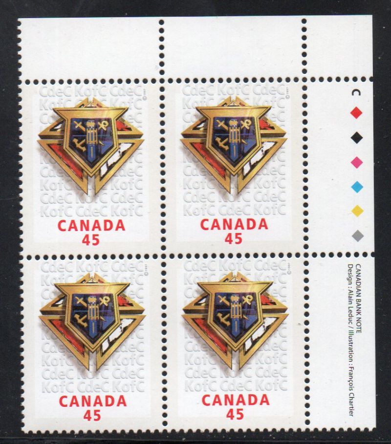 Canada Scott Catalogue number 1656 1997 45 cent Knights of Columbus  Upper Right  Inscription  Block of 4, Canadian Bank Note .Mint, fine to very fine original gum never hinged .Canadian Customers - no added GST/HSTUS customers - No tariffs on stamps sent by meMember Canadian Stamp Dealers Association