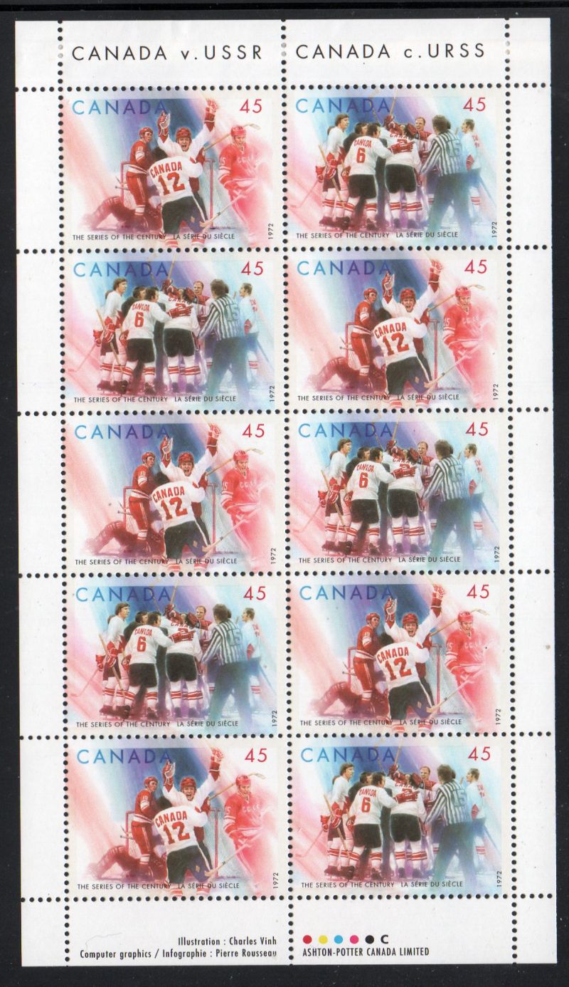 Canada Scott Catalogue number 1660a 1997 25th Anniversary Hockey Series of the Century Canada vs USSR stamp booklet pnae..Mint, fine to very fine, original gum never hinged .Canadian Customers - no added GST/HSTUS customers - No tariffs on stamps sent by meMember Canadian Stamp Dealers Association