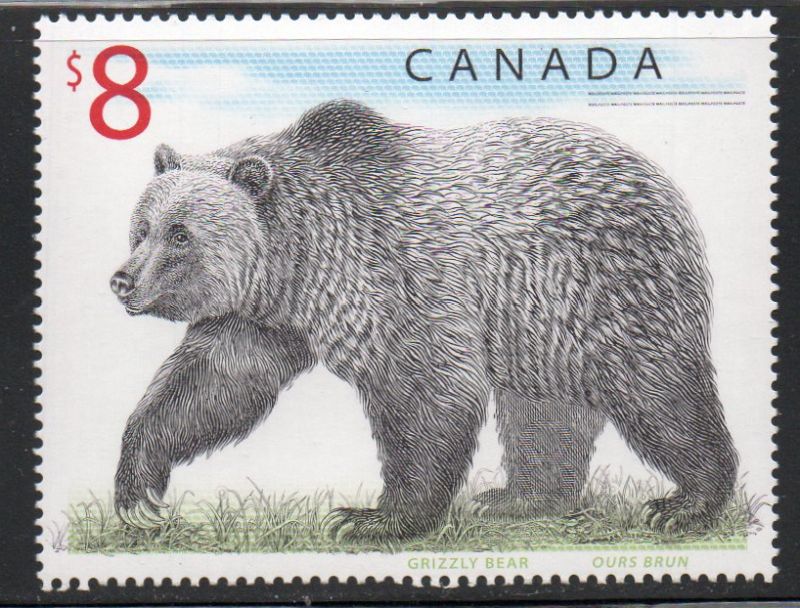 Canada Scott Catalogue number 1694 1997 $8 Grizzly Bear stamp.Mint, fine to very fine original gum never hinged .Canadian Customers - no added GST/HSTUS customers - No tariffs on stamps sent by meMember Canadian Stamp Dealers Association