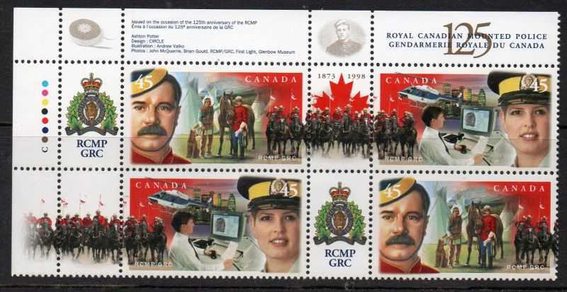 Canada Scott & Unitrade Specilalized Catalogue number 1737a 1998 RCMP Anniversary Inscription Block of 4 Upper Left .