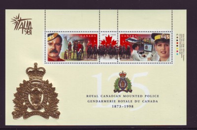 Canada Scott & Unitrade Catalogue number 1737e 1998 RCMP Anniversary stamp souvenir sheet with ITALIA 98 stamp show overprint.Mint, fine to very fine, original gum never hinged .Member Canadian Stamp Dealers Association .Canadian Customers - I pay the GST/HST on your purchases from me .