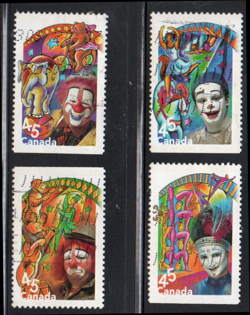 Canada Scott & Unitrade Catalogue number 1757-1760 1998 The Circus stamp set .Used, fine to very fine .Canadian Customers - I pay the GST/HST on your purchases from me