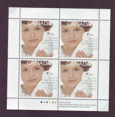 Canada Scott Catalogue number 1813 1999 55 cent Child & Dove stamp sheet of 4 .Mint, fine to very fine, original gum never hinged .Member Canadian Stamp Dealers Association .Canadian Customers - I pay the GST/HST on your purchases from me .