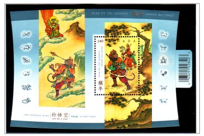 Canada Scott & Unitrade Specialized Catalogue number 2016 2004 Year of the Monkey stamp souvenir sheet .Mint, fine to very fine, original gum never hinged.Member Canadian Stamp Dealers AssociationCanadian Customers - I pay the GST/HSt on your purchases from me .
