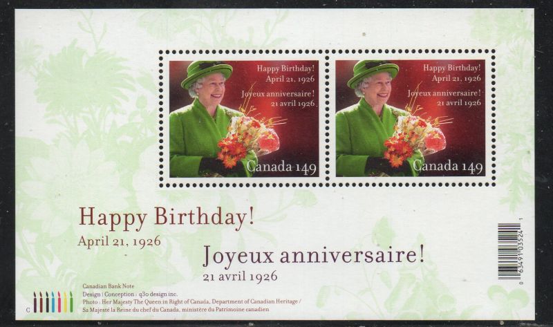 Canada Scott & Unitrade Catalogue number 2150 2006 80th Birthday QE II stamp souvenir sheet .