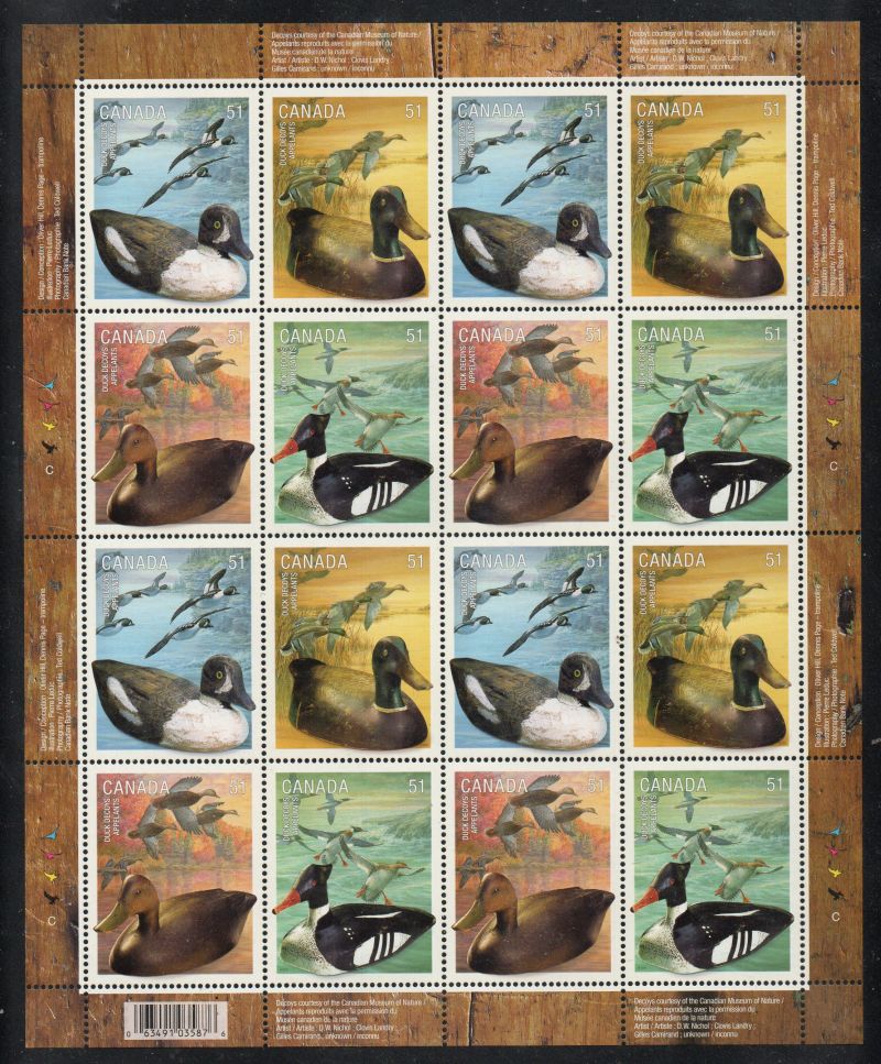 Canada Scott & Unitrade Catalogue number 2163-2166 2006 Duck Decoys stamp sheet of 16.Mint fine to very fine, original gum never hinged .Member Canadian Stamp Dealers Association .Canadian Customers - I pay the GST/HST on your purchases from me .