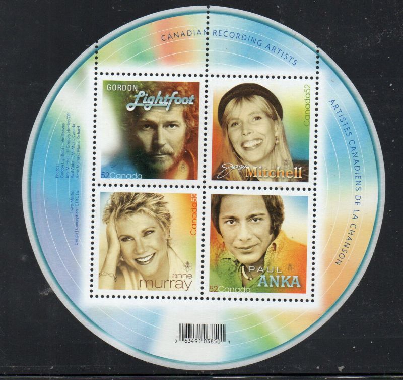 Canada  Scott & Unitrade  Catalogue number 2221 2007 Recording Artists stamp souvenir sheet .Mint fine to very fine, original gum never hinged .Member Canadian Stamp Dealers Association .Canadian Customers - I pay the GST/HST on your purchases from me .