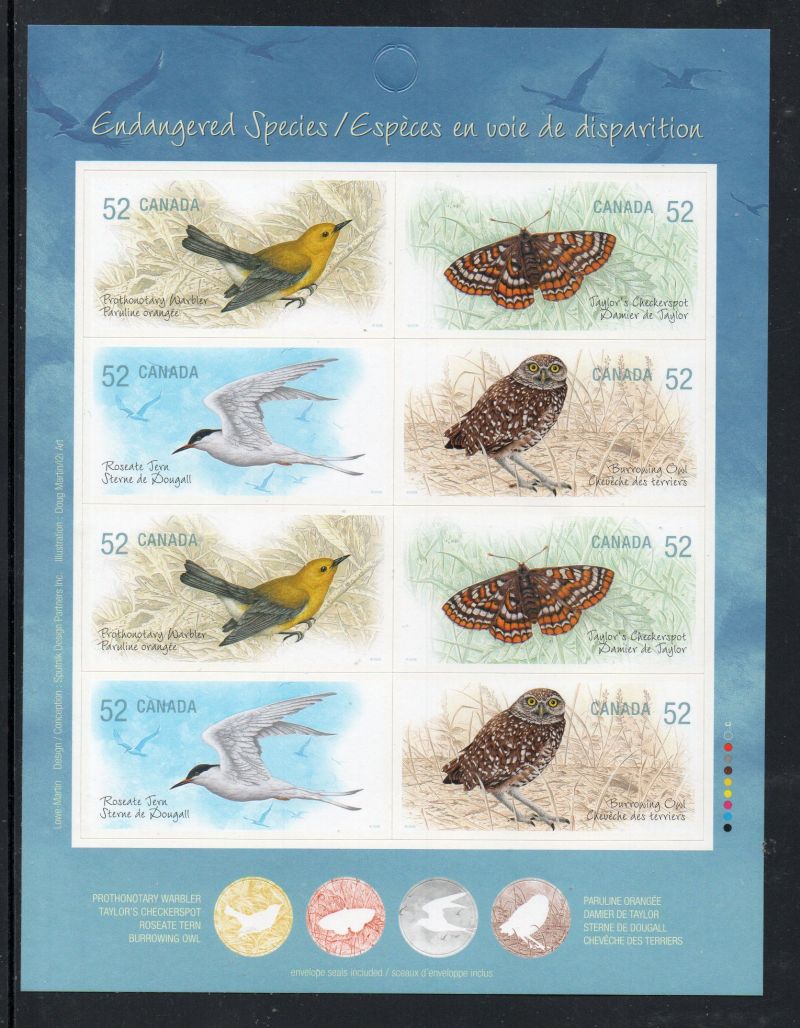 Canada Scott & Unitrade Catalogue number 2289b, 2008 52 cent Endangered Species  self adhesive stamp booklet pane of 8 ..Mint, fine to very fine, original gum never hinged .Member Canadian Stamp Dealers AssociationCanadian Customers - No added GST/HST .US customers - There is no tariff on postage stamps that I send to you.