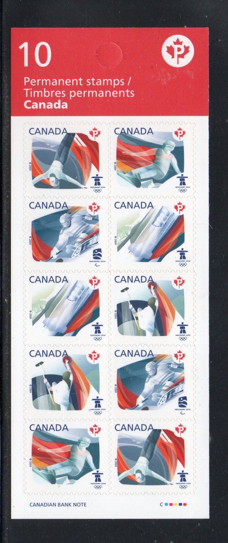 Canada Scott & Unitrade Catalogue number 2304a, BK 395, 2009 "P" Vancouver Olympics self adhesive stamp booklet pane of 10.