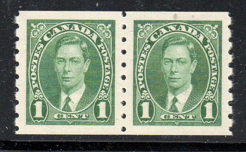 Canada Scott & Unitrade Catalogue number 238 1937 1 cent green George VI coil stamp pair .