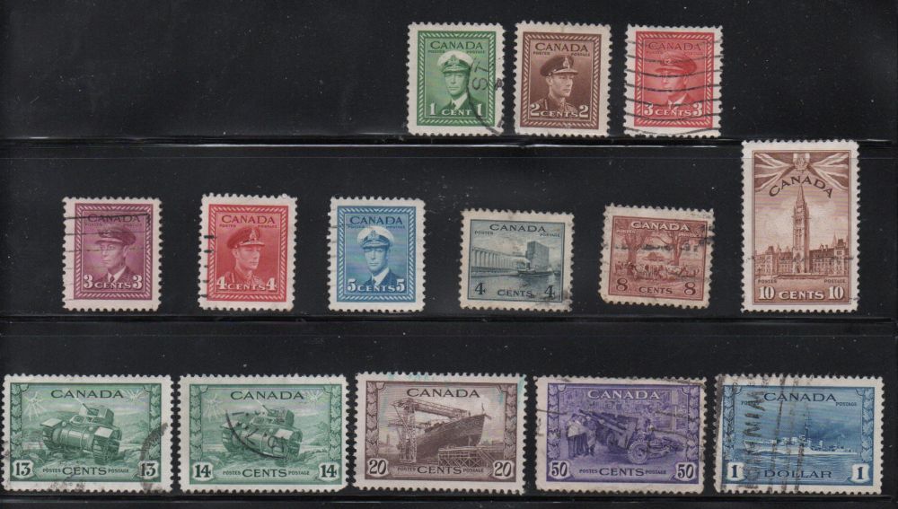 Canada Scott & Unitrade Catalogue number 249-262 1942 George VI War stamp set.Used, fine to very fine.Canadian Customers - I pay the GST/HST for you19-2-1.jpg