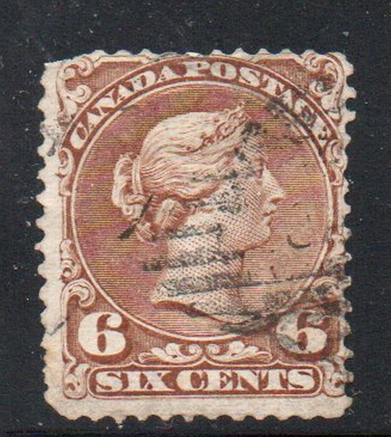 Canada Scott & Unitrade Catalogue number 26 1868 6 cent dark brown Large Queen Victoria stamp .Used, very good .Canadian Customers - No added GST/HST .US customers - There is no tariff on postage stamps that I send to you.26-1-42.jpg