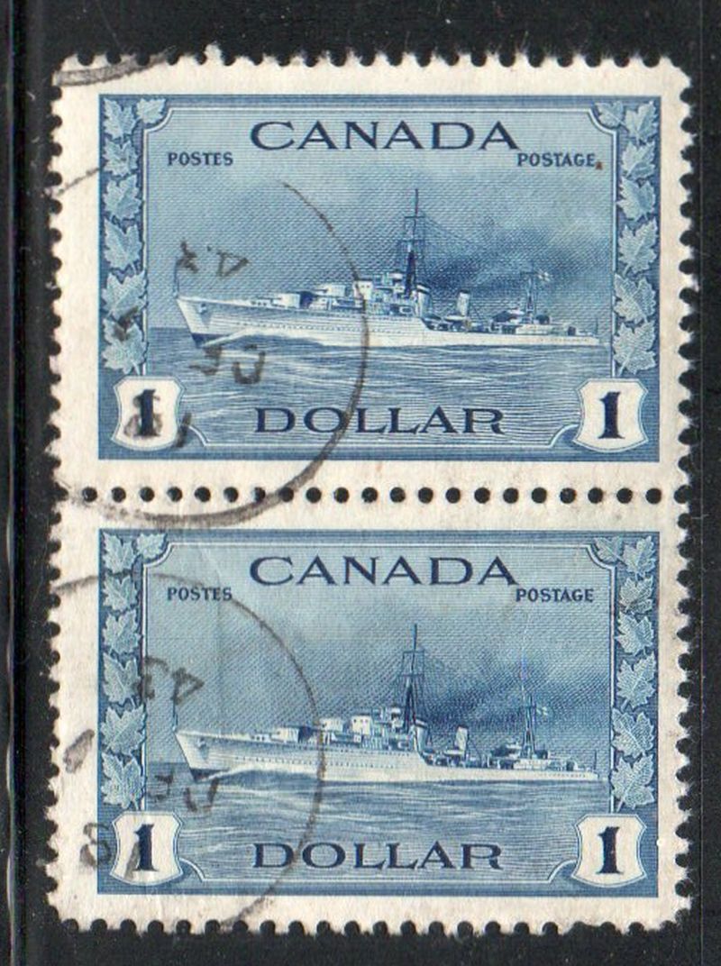 Canada Scott & Unitrade Specialized Catalogue number 262 1942 $1 deep blue Destroyer stamp pair .Used, fine to very fine .Member Canadian Stamp Dealers Association .Canadian Customers - I pay the GST/HST on your purchases from me .25-8-36.jpg