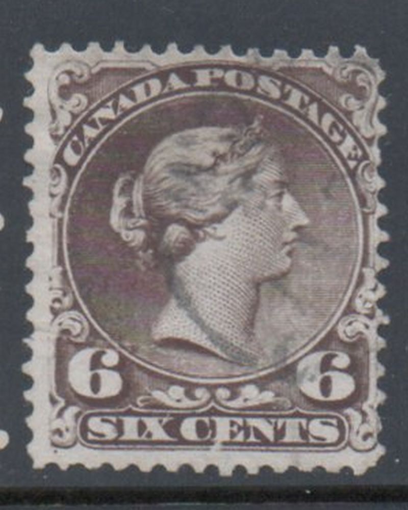 Canada Scott & Unitrade Catalogue number 27 1868 6 cent dark brown large Queen Victoria stamp .Used, very good to fine Member Canadian Stamp Dealers Association .Canadian Customers - I pay the GST/HST on your purchases from me .25-8-103.jpg