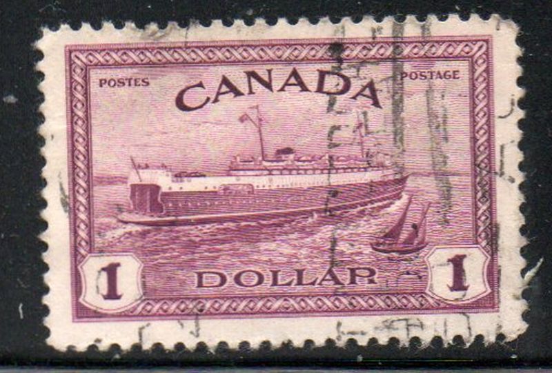 Canada Scott & Unitrade Specialized Catalogue number 273 1946 $1 Ferry Boat stamp .Used, fine to very fine .Member Canadian Stamp Dealers Association .Canadian Customers - I pay the GST/HST on your purchases from me .25-8-38.jpg